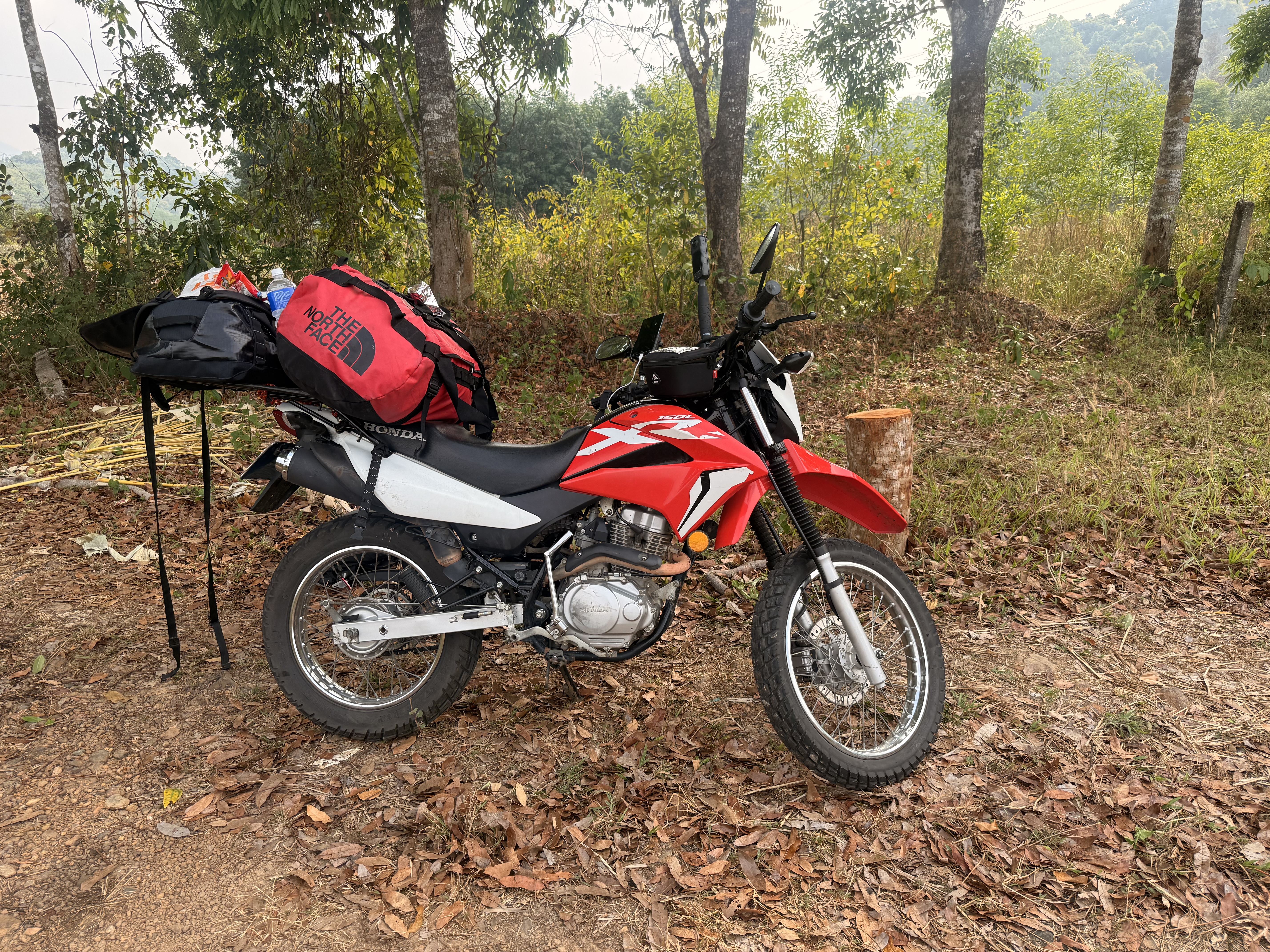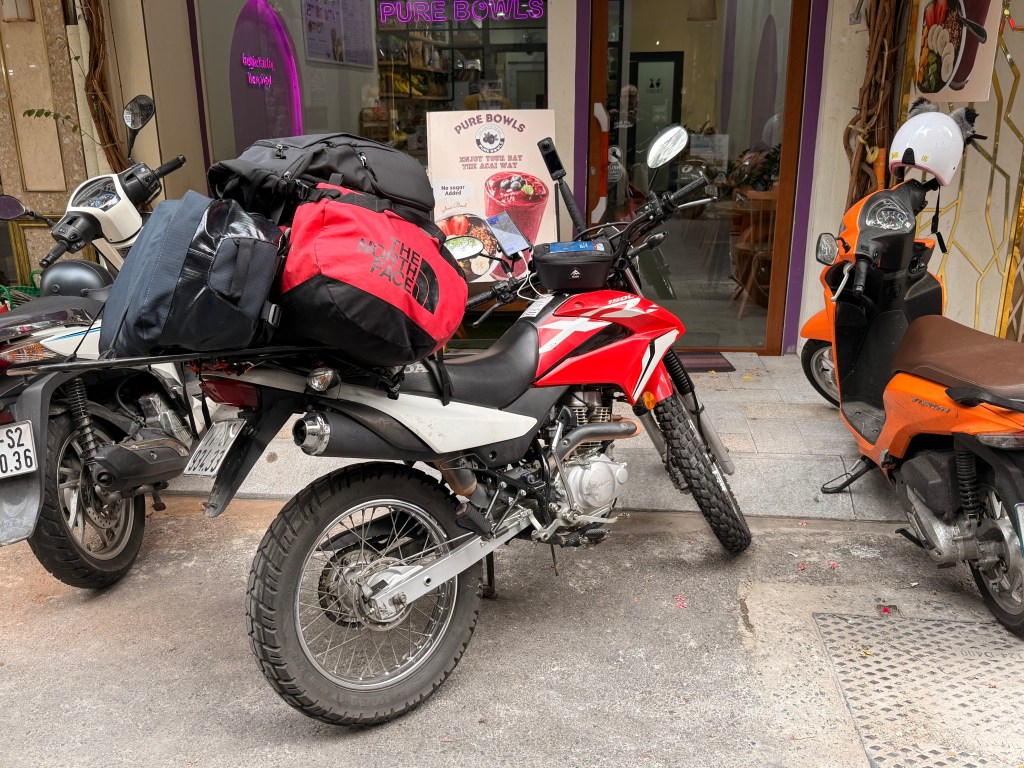 So here I am, stood by the relatively small Honda 150XL with 3 bags weighing upwards of 60KG and only 2 straps to tie everything down with!