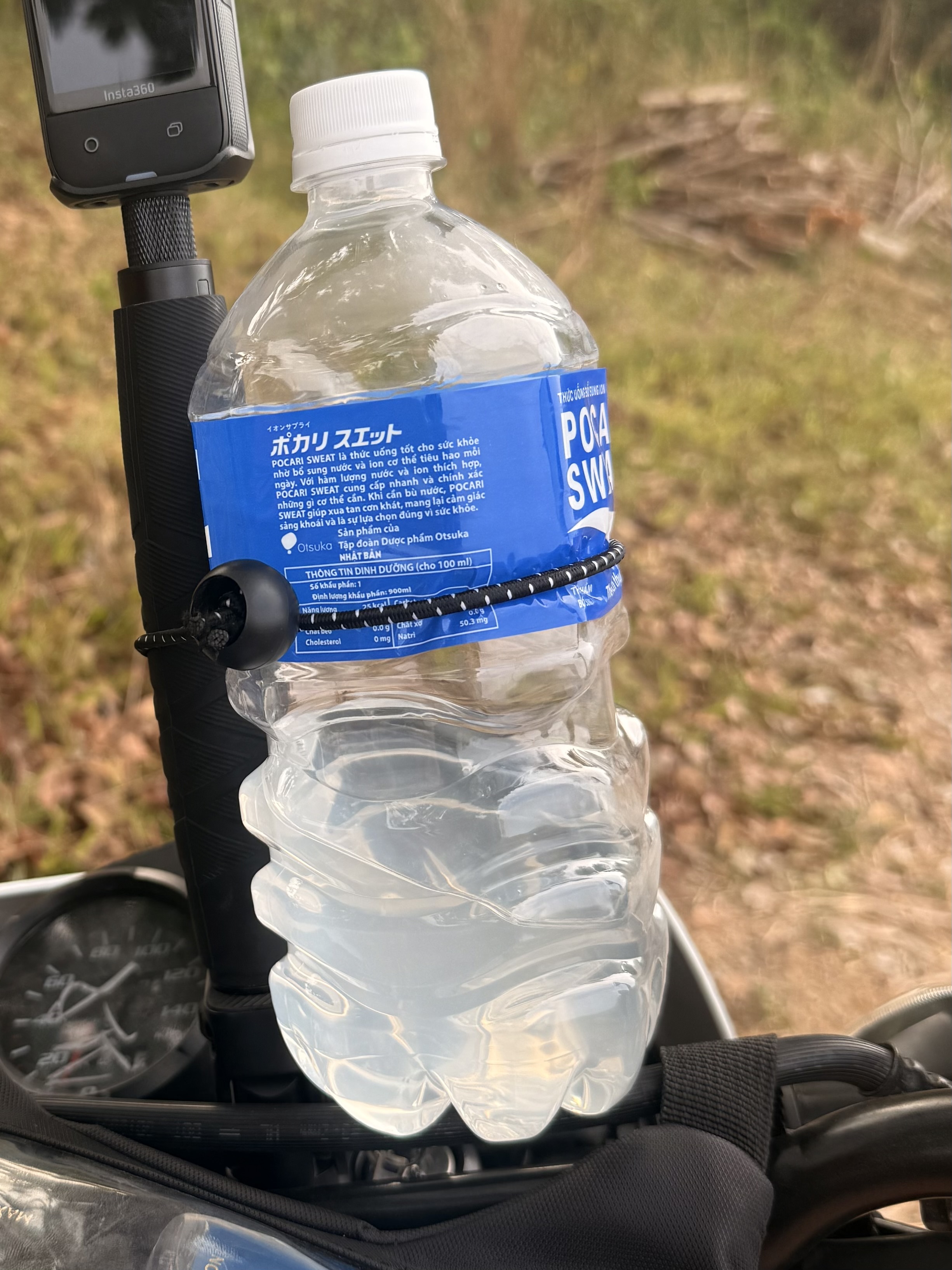 I noticed that the Pocari Sweat bottles here in Vietnam are RIBBED. Whereas the bottles in the UAE are smooth (like the pictures below). What I discovered about the RIBBED ones (which was super-helpful) is that they can be easily attached to the outside of my bags (or my Insta360 mount), using bungee chords, making them easily available when I stop – side of the road, traffic lights etc. RIBBED bottles are AWESOME!